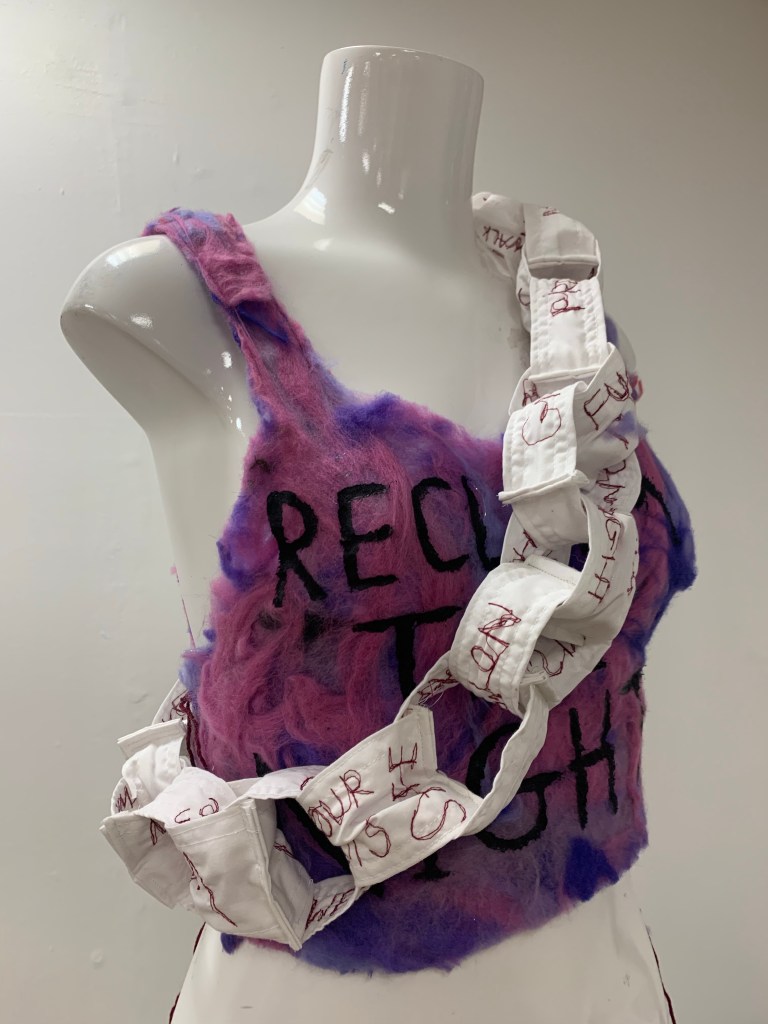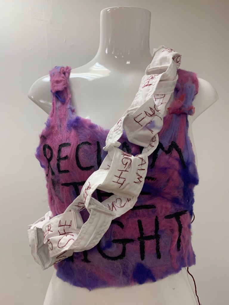 Finally I began to work on my final piece, I stayed with the idea of the chain, however due to the amount of material I had with the shirt I decided I would make it into a sash, inspired my the ones which was worn during the votes for women protests, to do this I created lots of loops out of the shirt which I chose, I then machine embroidered onto them with bright red thread with lots and lots of slogans which I pulled directly from signs I had seen. I am really pleased with the outcome of the sash, however the one downside is that when the sash is worn you cant see whats written on it unless you look really closely, therefore if I had another chance to make it I would make the slogans a lot bigger and with thicker writing so it would be a lot easier to read. I then did some more trials with painting onto fabric with fabric paint so it sticks and went onto creating the felt top. The aim was to create a top which looked like night time and I think this outcome was pretty successful as the purples and blues really create the look of night, the fabric paint on top is also really good because it stands out and is a lot easier to read than the sash. The only thing which I would change would be that I would make the straps a lot thicker so they aren’t as thin because felt is quite easy to break and quite fragile so I had to reinforce them with some sewing.