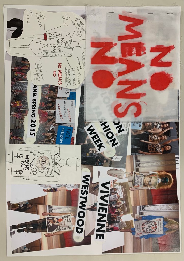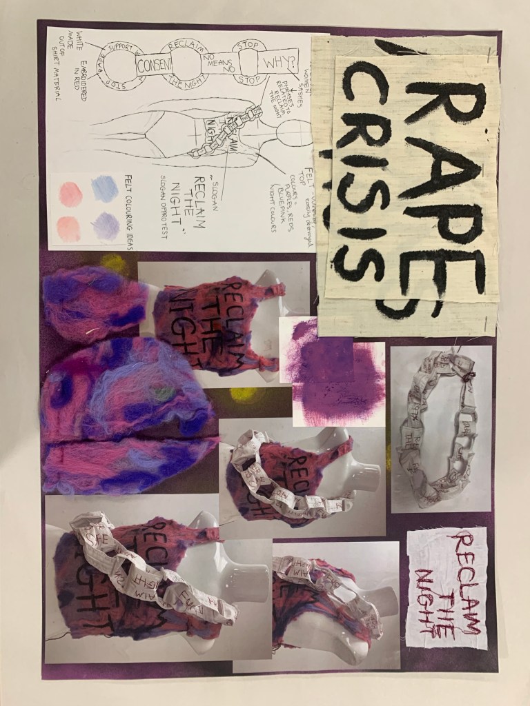 Overall, I am feeling very positive about my outcome for my Fashion and Textiles Pathway, I am very pleased with my choice to use Reclaim the Night as my protest of choice because I think its one of the most important protests as it supports women’s rights and protests for women to be able to walk alone down the street without falling victim to sexually harassing comments. To express this, I created my first A2 piece which was through the form of collage, and I used some of my own primary resources since I had some photographs from past Reclaim the night protests which I had attended, I mixed this with secondary research I found from some articles online which related to Lorraine Cox and the origins of Reclaim the night. I experimented with many different types of textiles experimentation during this project, the first of which was screen printing, a method I had never used before, it required cutting out a design onto reflective paper, mixing colour with fabric binder and pulling a board over a printing screen to transfer the ink through the gaps. The results weren’t the best because it was my first time doing this process so I didn’t pull the board hard enough across the fabric, however upon reflecting I really liked this process, It was a lot quicker and easier than I first thought it would be, while it was a good way to respond to Katherine Hamnet, one of the artists I looked into for ideas for my protest shirt, I didn’t feel like it was right for this project since for my final piece I decided to create a felt top and screen printing needs a flatter surface to print effectively. Felt is one of the newer techniques which I learnt about during skills week, I had only created one piece before, but I thought that I would try and be ambitious and create a whole night themed top which I then used fabric paint to paint “Reclaim the night” onto. I was very pleased with the result, I toyed between using white paint onto the felt however during my experimentation work l used some white paint on red felt and it didn’t look nearly as effective as I thought black would stand out a lot more and fit with the night theme, although the white would have looked complimentary to the sash. The sash is one of my favourite pieces that I have created because I was able to use a lot of machine embroidery and practice my precision with the machine as machine embroidery is also one of the skills I learnt in skills week and was one of the things that really sparked my creativity. The outcome of the sash was really effective, minus the fact that the words are hard to read since some of them are a bit small, I think my overall piece is quite strong as the top and sash would be something you could easily wear to a protest while reflecting the cause, while the two pieces don’t match in any way I don’t really think they need to, protest is not necessarily something which matches or requires a certain look, it is meant to be something which has a message or meaning and represents a bigger cause and I feel like my piece does that effectively.